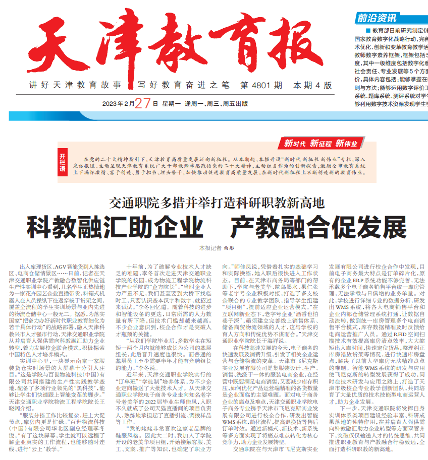 2023年2月27日《天津教育报》头版头条以《科教融汇助企业 产教融合促发展》为题对beat365物流专业群校企联合,积极探索中国特色人才培养模式,发挥实训体系类项目建设丰富经验,推进职业教育产教融合,全面打造科研职教新高地进行了宣传报道,起到了良好的社会影响。