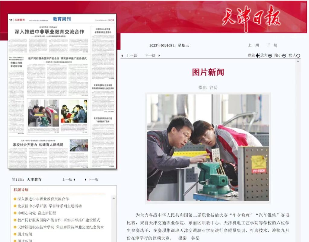 2023年3月8日《天津日报》教育周刊中刊登了beat365官网中文作为中华人民共和国第二届职业技能大赛“车身修理”“汽车维修”赛项集训场地,为beat365官网中文、东丽区职教中心、天津机电工艺学院等学校的六位学生参赛选手提供实训场地,进行高质量集训,打磨技术,为迎接九月份在津举行的该项大赛做充足准备。