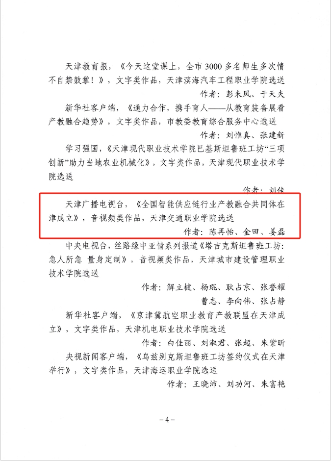 为深入学习宣传贯彻习近平文化思想、习近平总书记视察天津重要讲话精神,进一步加强教育新闻舆论工作,市教育两委组织开展了2023年度天津市“十大教育新闻作品”评选活动。经自主申报、专家评审、网上公示,学院《全国智能供应链行业产教融合共同体在津成立》《壮志豪情浴火青春》两部作品成功获评天津市“十大教育新闻作品”。