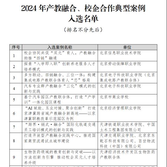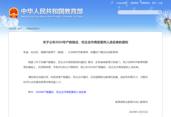 2024年12月25日,教育部公布了2024年产教融合、校企合作典型案例遴选结果,beat365报送的《打造开放型产教融合实践中心,推进国家商贸流通试点城市建设》被入选为教育部2024年产教融合、校企合作典型案例。