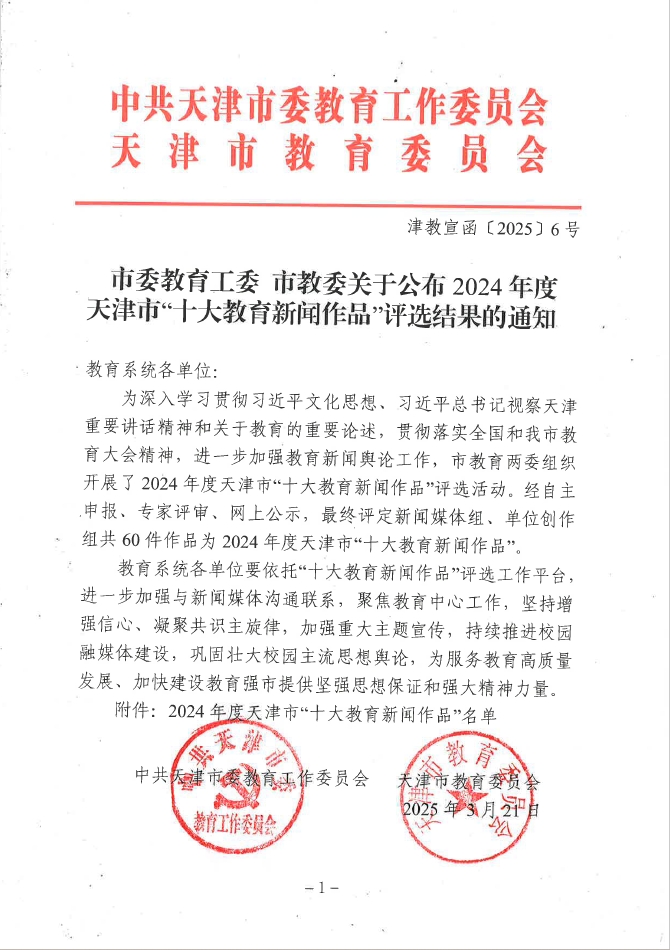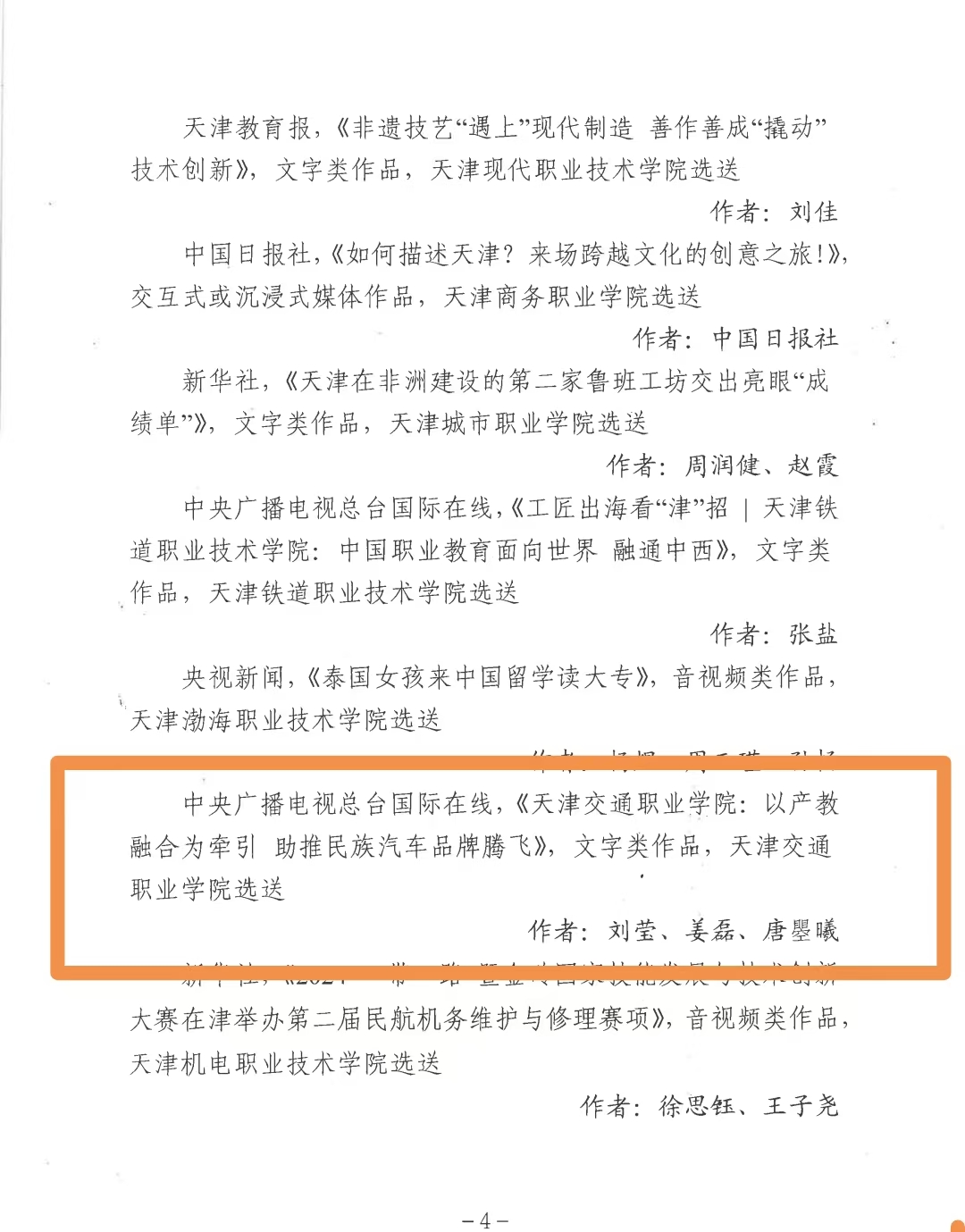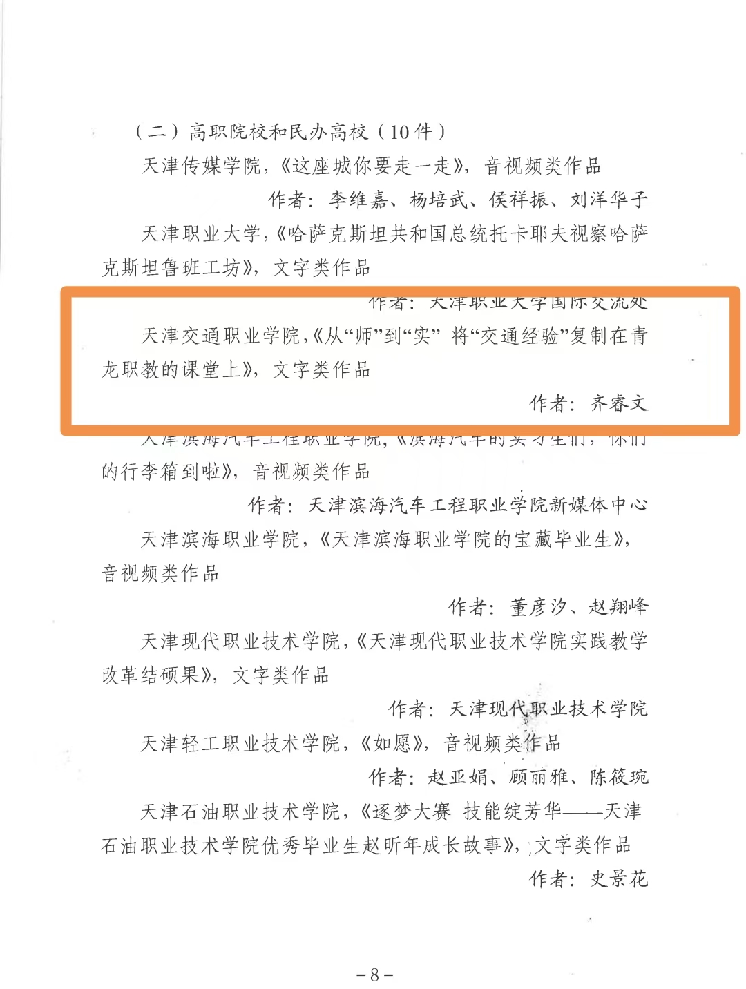 近日,天津市教育两委公布了2024年度天津市“十大教育新闻作品”评选结果。经自主申报、专家评审及网上公示,beat365报送的《从“师”到“实”将“交通经验”复制在青龙职教的课堂上》和《beat365官网中文:以产教融合为牵引助推民族汽车品牌腾飞》两部作品从众多参评作品中脱颖而出,被评选为2024年度“十大教育新闻作品”。